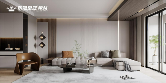 當(dāng)花色雅致與品質(zhì)硬核形成合力,東冠皇冠板材以空間為畫布,讓“光環(huán)”自然流淌。它從家居整體性出發(fā),讓每塊板材與環(huán)境和諧共生。不同風(fēng)格場(chǎng)景中,其定位精準(zhǔn):現(xiàn)代簡(jiǎn)約客廳,淺色系板材配金屬線條,簡(jiǎn)潔利落且細(xì)膩紋理在光影間若隱若現(xiàn);新中式書(shū)房,帶天然木紋的板材與水墨呼應(yīng),山形紋、直紋等盡顯東方韻味。這種適配性源于對(duì)空間美學(xué)的理解——板材是“底色”,精心打造的紋理既顯特質(zhì),又為其他元素留空間,達(dá)成“1+1>2”的效果。