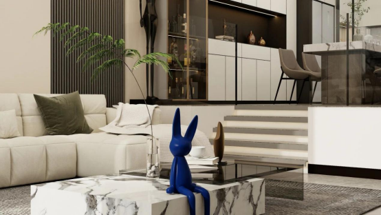 餐廳區(qū)域,餐邊柜采用“封閉柜體+玻璃酒柜”的組合形式,白色啞光柜體營造極簡基調(diào),黑色開放格形成視覺焦點(diǎn),金色金屬邊框的玻璃酒柜則如藝術(shù)展柜般,將酒品陳列轉(zhuǎn)化為空間裝飾元素,在黑白灰的主色調(diào)中注入精致感,使餐邊柜成為餐廳區(qū)域的視覺錨點(diǎn),與整體空間的現(xiàn)代風(fēng)格形成呼應(yīng),同時通過材質(zhì)與色彩的對比,構(gòu)建出富有層次的視覺節(jié)奏。