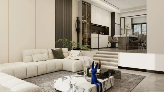 沙發(fā)背后與餐廚區(qū)定制餐邊柜采用一體化設(shè)計(jì)邏輯,通過玻璃、金屬框與同色系板材的材質(zhì)呼應(yīng),以及線條的無縫延續(xù),消弭了客廳與餐廚空間的物理割裂感。